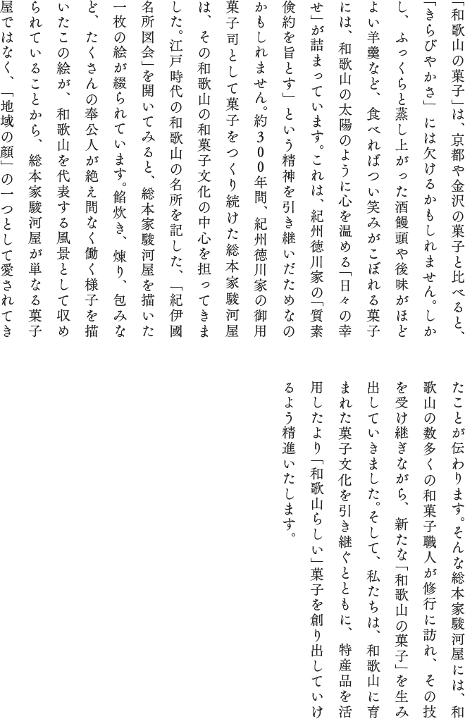 同じく江戸時代、総本家駿河屋に大きな転機が訪れました。徳川家康の十男であり、八代将軍・徳川吉宗の祖父にあたる徳川頼宣公との出会いです。頼宣公は幼少時代から総本家駿河屋の菓子を気に入られたと見え、駿河(現在の静岡県)へお移りになる際、総本家駿河屋も共に駿河へお連れになりました。さらに頼宣公が紀州へ移り、紀州徳川家が興ったとき、総本家駿河屋も共に紀州へ。以降ずっと、紀州藩主に献上された菓子は、総本家駿河屋の菓子だったのです。そのひとつが、いまなお看板商品となっている「本ノ字饅頭」。参勤交代の際の携行食としてもお納めして